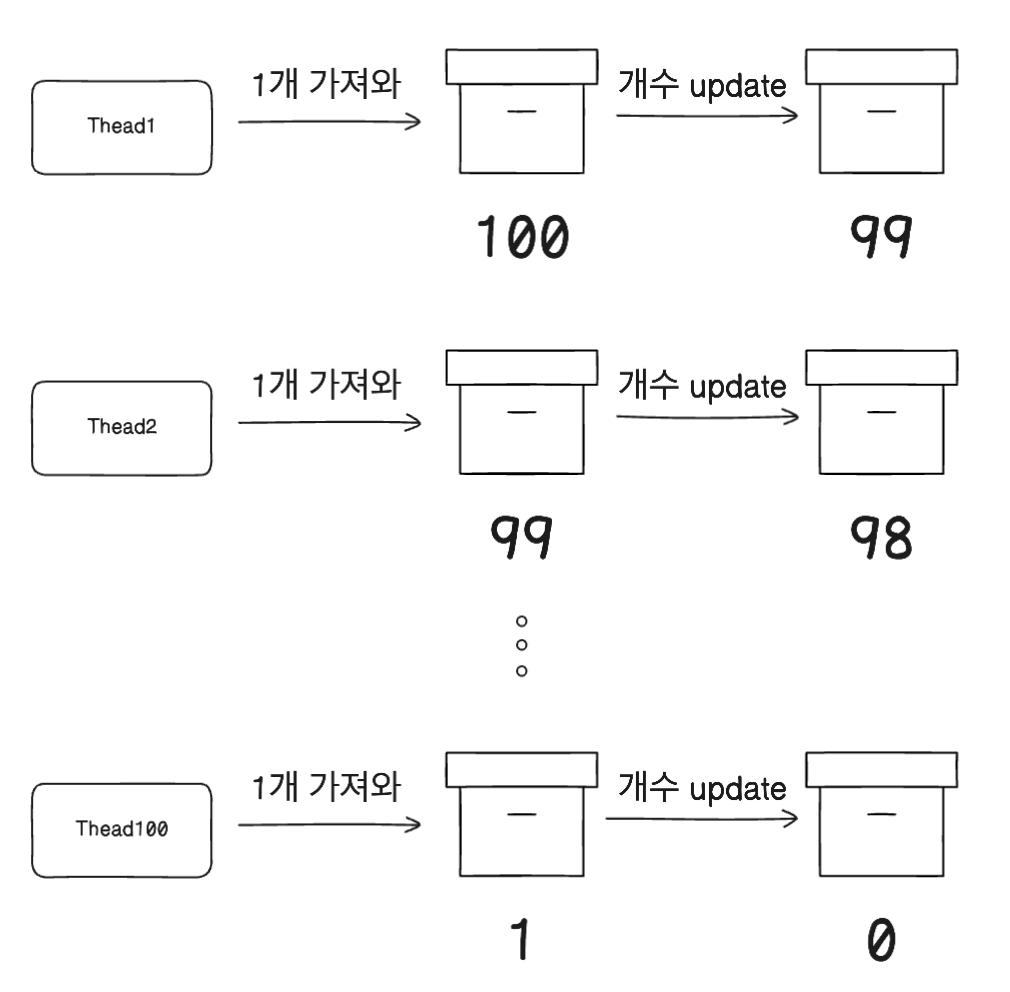 1개씩 감소시키는 코드를 100개의 쓰레드가 처리했으니 총 100의 재고가 감소되어 100(원래 수량) - 100 = 0 이라고 기대할 수 있다.