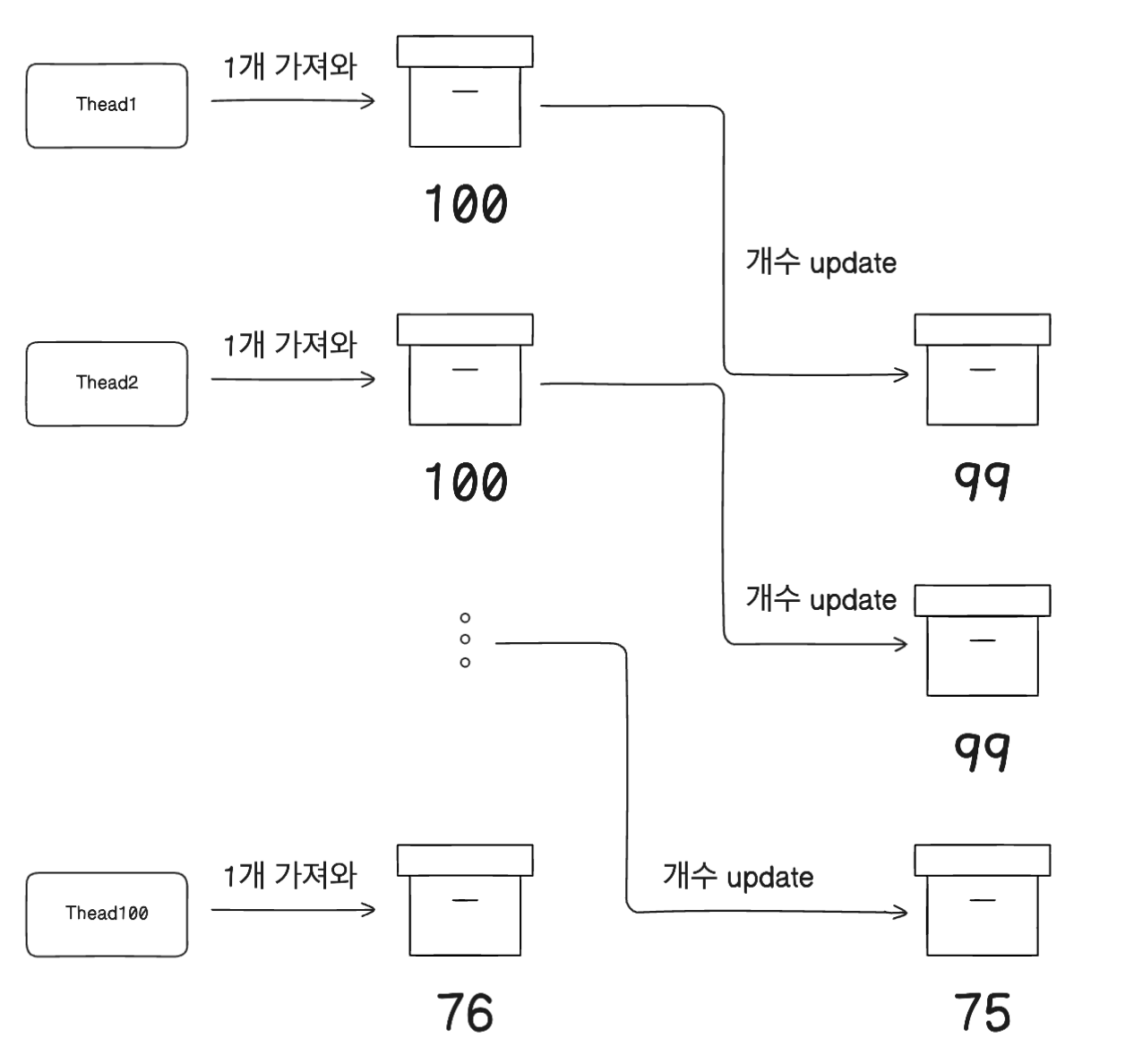 이런식으로 계속 동시에 변경을 하려는 시도가 이루어져 결국 Thead100이 마지막으로 실행이 되었을 때 남은 재고는 0이라고 기대를 할 수가 없다. (그림으로는 Thead100이 접근할때는 재고가 76개라고 했지만 이것도 확정이 아닌 계속 바뀐다)