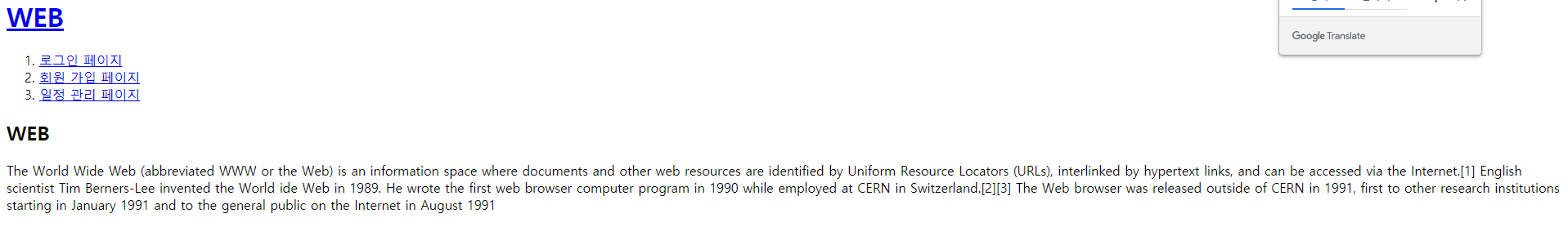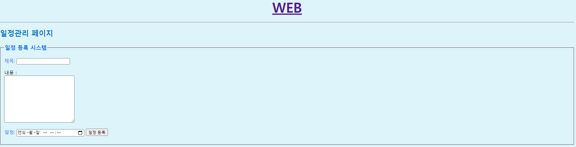 일정관리를 누르면 이렇게 일정관리 페이지로 넘어가게만 만들어봤다 ! 그리고 오늘은 css를 조금 배워서 css도 적용하여 실습해봤다!